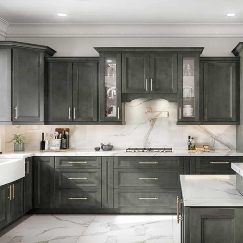 Our Smokey Grey cabinet line receives a transitional style door & drawer front with a contemporary stain grey finish. Smokey Grey perfectly compliments both traditional and contemporary spaces, plus it comes standard with soft-closing hinges & drawer-glides.